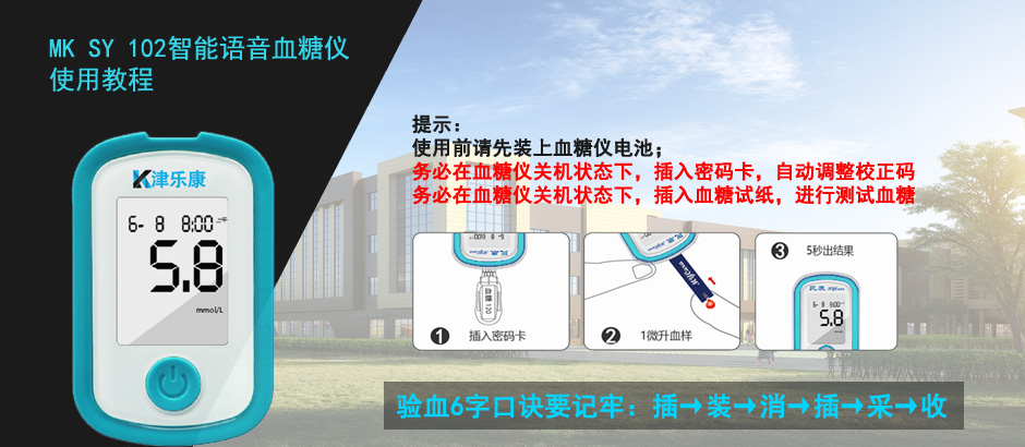 民康MK SY102智能語音血糖儀使用教程,提示: 使用前請先裝上血糖儀電池; 務(wù)必在血糖儀關(guān)機狀態(tài)下,插入密碼卡,自動調(diào)整校正碼 務(wù)必在血糖儀關(guān)機狀態(tài)下,插入血糖試紙,進行測試血糖